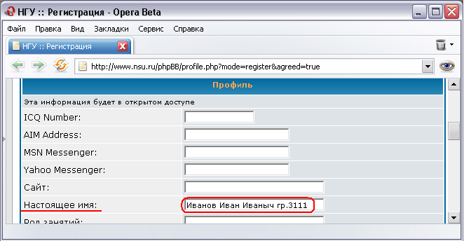 2. В разделе "Профиль", в поле "Настоящее имя" указать